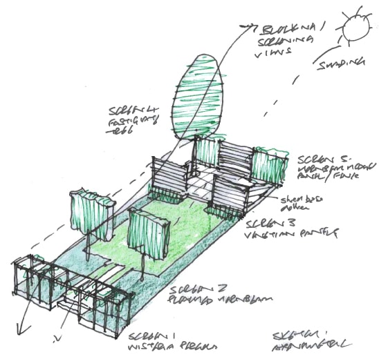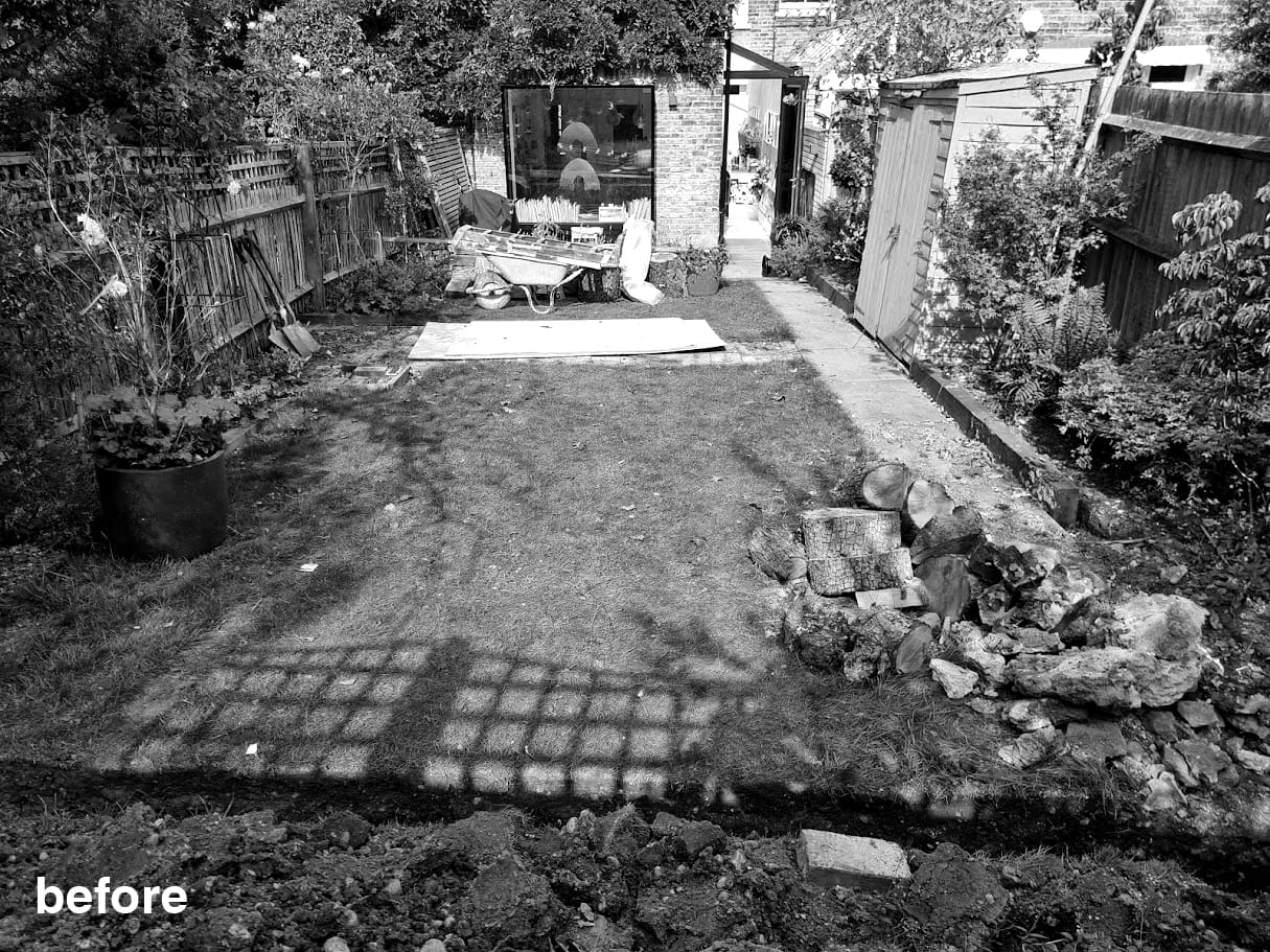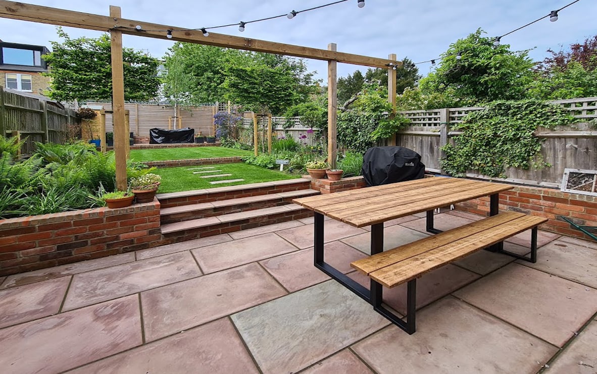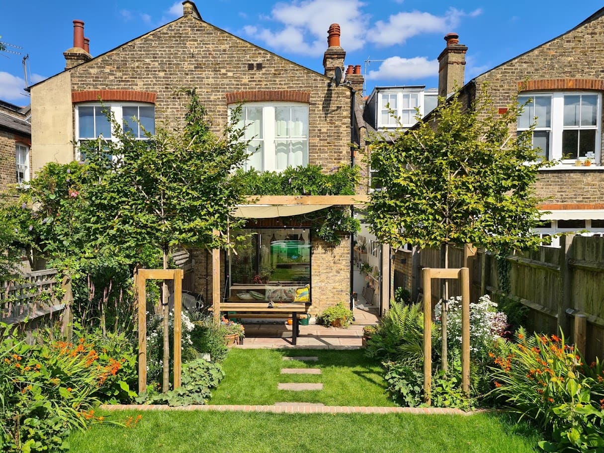 This garden project was to design a multi-functional outdoor oasis bringing calm to busy family life within a small rectangular overlooked back garden on a classic Edwardian terraced street. The change in level from front to back helped the design evolve and be zoned into 3 areas of sitting, grass and borders, and outside dining and cooking. Vertical elements were included to screen views to and from the houses in close proximity, with pleached Hornbeam trees and full width timber pergolas being placed close to the house to provide privacy.